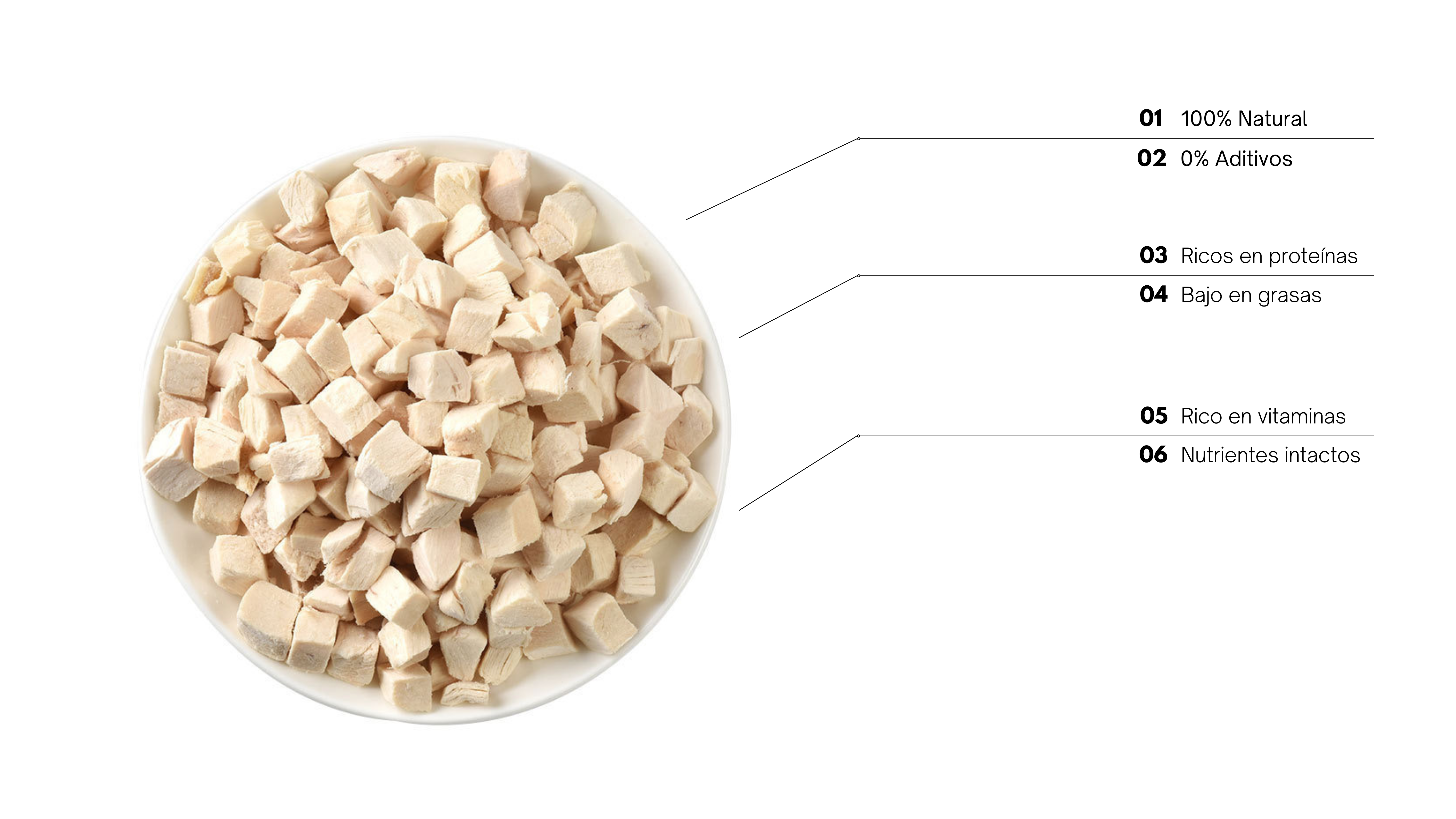 La liofilización conserva los nutrientes esenciales de la carne al máximo, ya que se realiza en frío, mientras que el deshidratado usa calor, lo que puede reducir el valor nutricional. Además, los premios liofilizados tienen una textura y sabor mucho más frescos y apetecibles, lo que los hace irresistibles para las mascotas. Así, cada bocado es no solo más nutritivo, ¡sino también mucho más sabroso para tu peludito!
