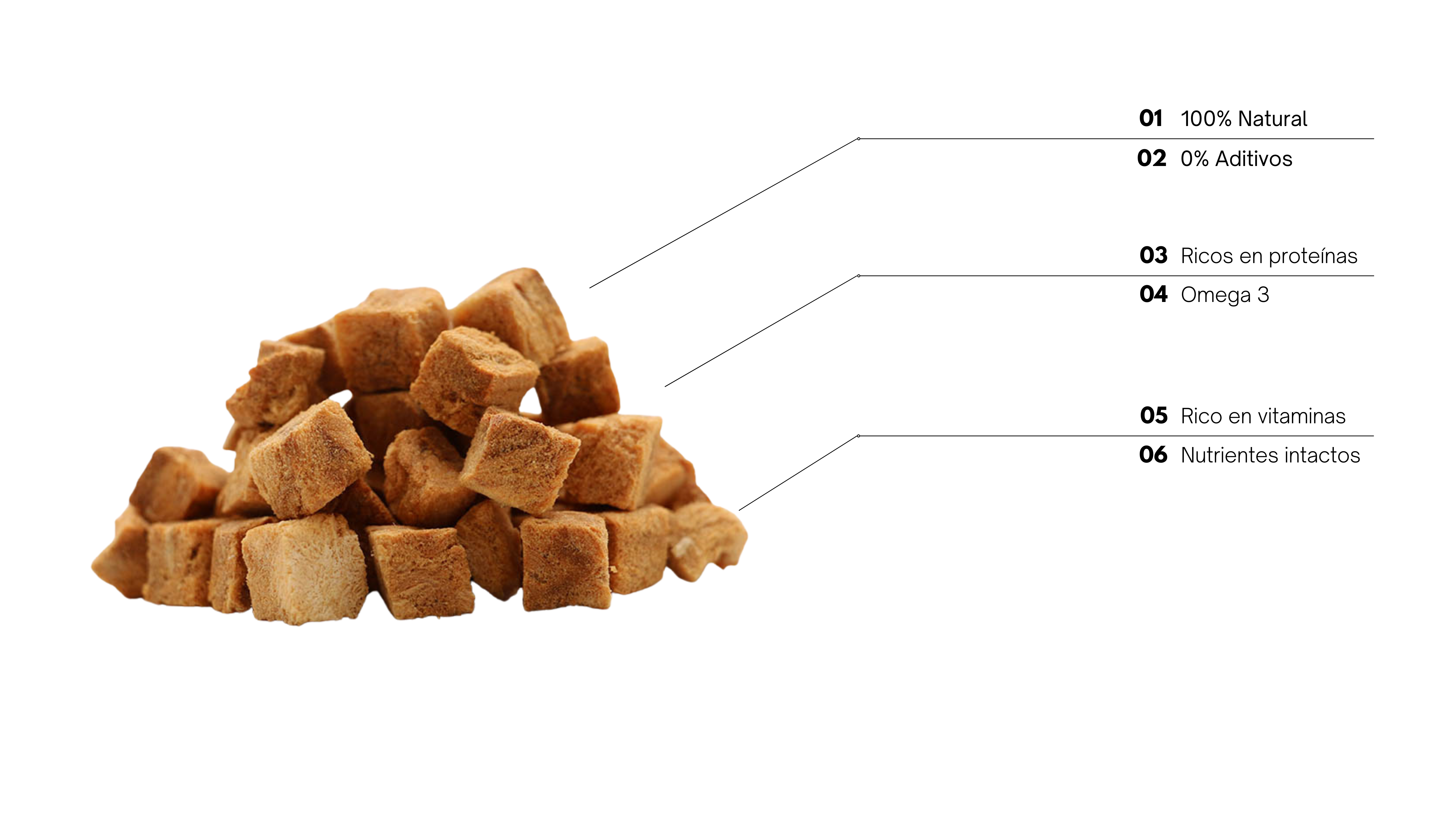 Cada bolsa contiene 50g de proteína pura y saludable, perfecta para premiar a tu peludo durante el entrenamiento, complementar su dieta diaria o simplemente darle un momento especial de sabor. Su tamaño pequeño y textura crujiente los hace ideales para perros y gatos de todas las edades y tamaños. Con NIONIO, no solo estás ofreciendo un premio delicioso, sino un snack funcional y natural que aporta ácidos grasos Omega 3, esenciales para una piel sana y un pelaje brillante. ¡Porque tu mejor amigo merece lo mejor en sabor, calidad y nutrición!